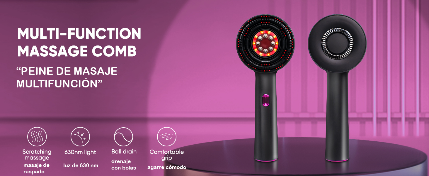 - 🔴 Luz roja de 630 nm combinada con 72 dientes redondeados que masajean profundamente, estimulan las raíces y favorecen un cabello más fuerte y abundante.